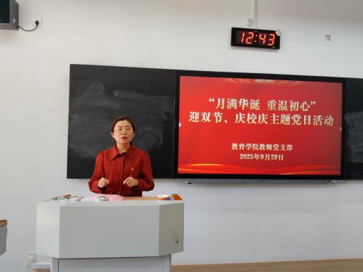 为迎接双节、庆贺校庆,9月29日,教育学院教师党支部开展了“月满华诞·重温初心”迎双节、庆校庆主题党日暨集体政治生日会活动。学院党总支书记段兆鑫、团总支书记齐菊、学生党支部书记倪雪以及群众杨辉、李兴娥共同参加了此次活动。活动由党支部书记苏倩主持。